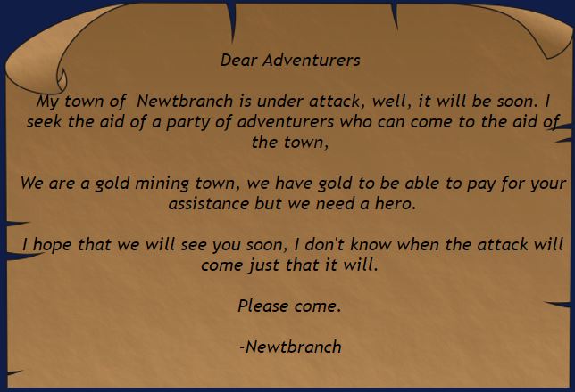 The party has received a non-marked call for aid. The letter is as follows. On the back of the scroll is a map and the advice on how to enter the town (where to call out to enter the town)