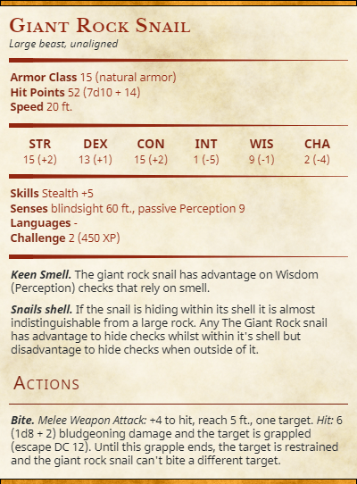 The boulders would remain hidden until they sense the party next to their shell – at which point they will sneakily attack one of the party trying to eat them. They whistle when they attack as air seems to rush through their bodies and out holes in their rock-like shell. This whistling will alert the other snails which will crawl forward and attack the nearest party member.