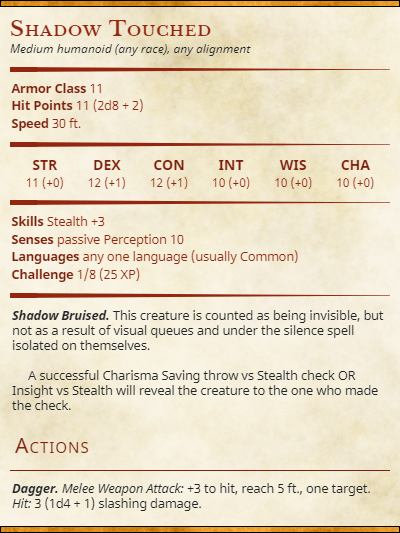 The first encounter, on deck should be like a script, if the party roll a successful Charisma Saving throw vs Stealth check OR Insight vs Stealth will reveal the creature to the one who made the check – but otherwise they don’t see the first shadow bruised until they hit the deck dead.