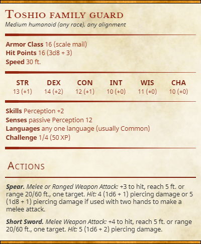 Toshio family guards will rush forward to do their leaders bidding. While loyal to Teng Yukri still holds sway with her magical charm and her commands are just followed as if Lord Toshio had given them himself. Although not all that impressive there is a lot of them and they will throw themselves at the party.