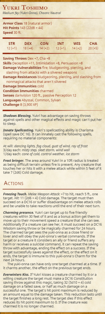 Thanks for visiting me tonight and getting a bit of a glimpse at Yukri, the frost maidens origin. Don’t forget to come back the last few nights this week for more content and, as always, don’t forget to roll with advantage, The Brazen Wolfe