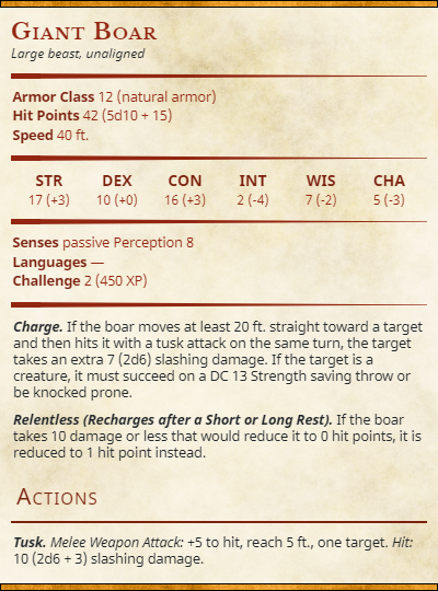 Although two distinct animals the giant boar and giant goat play the same role in this adventure – something that may attack if threatened, whether they believe they are or are actually in danger. I’d say a low perception check would lower the distance between the party and the creature before they are discover each other – if its within 20 feet (which, lets be reminded is only 3.5 times the height of an average person) then the Goat or Boar is spooked and will charge at the party.