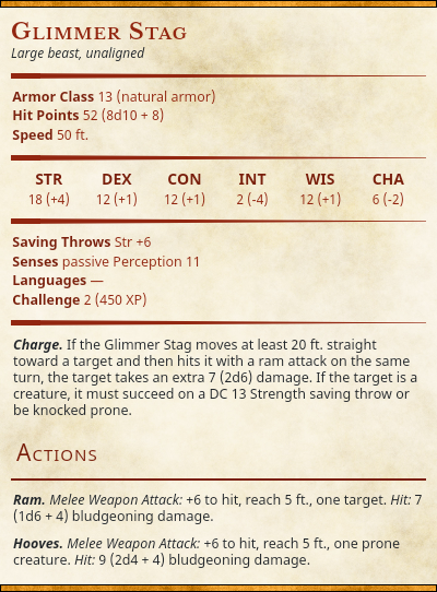 The glimmer stag is an elk like creature from the Kunagi Ranges which typically has white or light grey fur, large antlers for the males and shorter sharper ones for the females and a long bushy fox like tail.