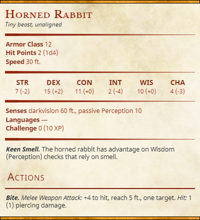 The Horned rabbit (Jackelope) is a strange creature. Small, non vicious but adorned with razor sharp horns that could gut a non defended man these creatures dart around skittishly without warning and their white coloured fur makes them difficult to see amongst the snow and ice.