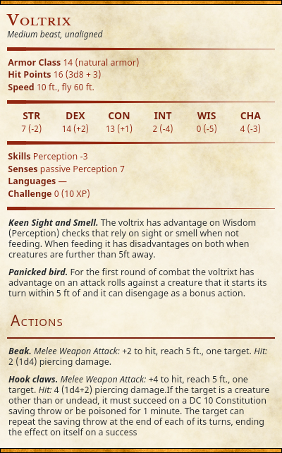 Appearing something like a serpentine, winged and scaled vulture, the Voltrix is a flying scavenger the size of a large dog with a beaked reptilian head, bat like wings ending in gripping hook like claws which they use to grip and cut into their food, cutting and ripping open skin and middle to expose softer tissues like organs and fat.