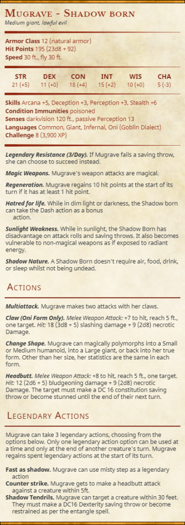 The real difference is that when she gets below 50 hp I would impose disadvantage on her attacks and checks – the reason is that the Shadow is trying to take back his power when he can see that she will lose. This should be described as Mugrave begging the Shadow to restore her power as she is fighting and perhaps fighting more erratically and viciously.