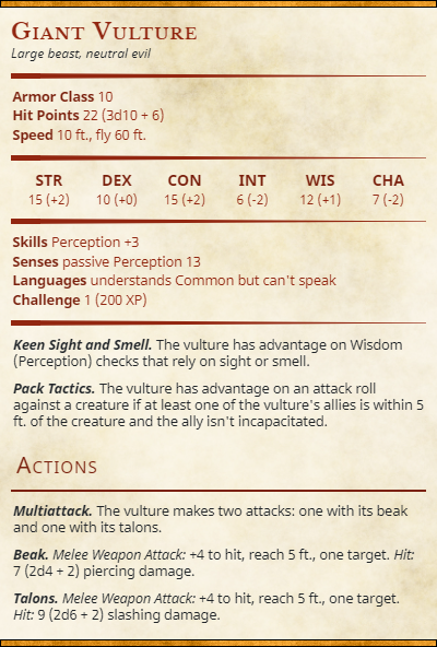 Now the giant vulture in this instance of it looks like its not that strong but having a few ambush the party could be an interesting way to start us off. It will hint to the party that they are being watched or at least searched for.