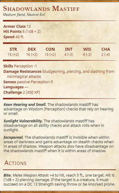 The mastiff is part of the night time encounter, a few of these could be quite the challenge for the party. In fact this is especially so if they attack a party member who is isolated and drag them off into the darkness to be… well… eaten.