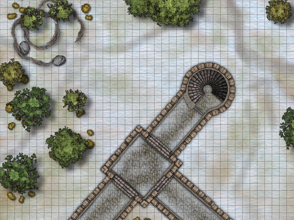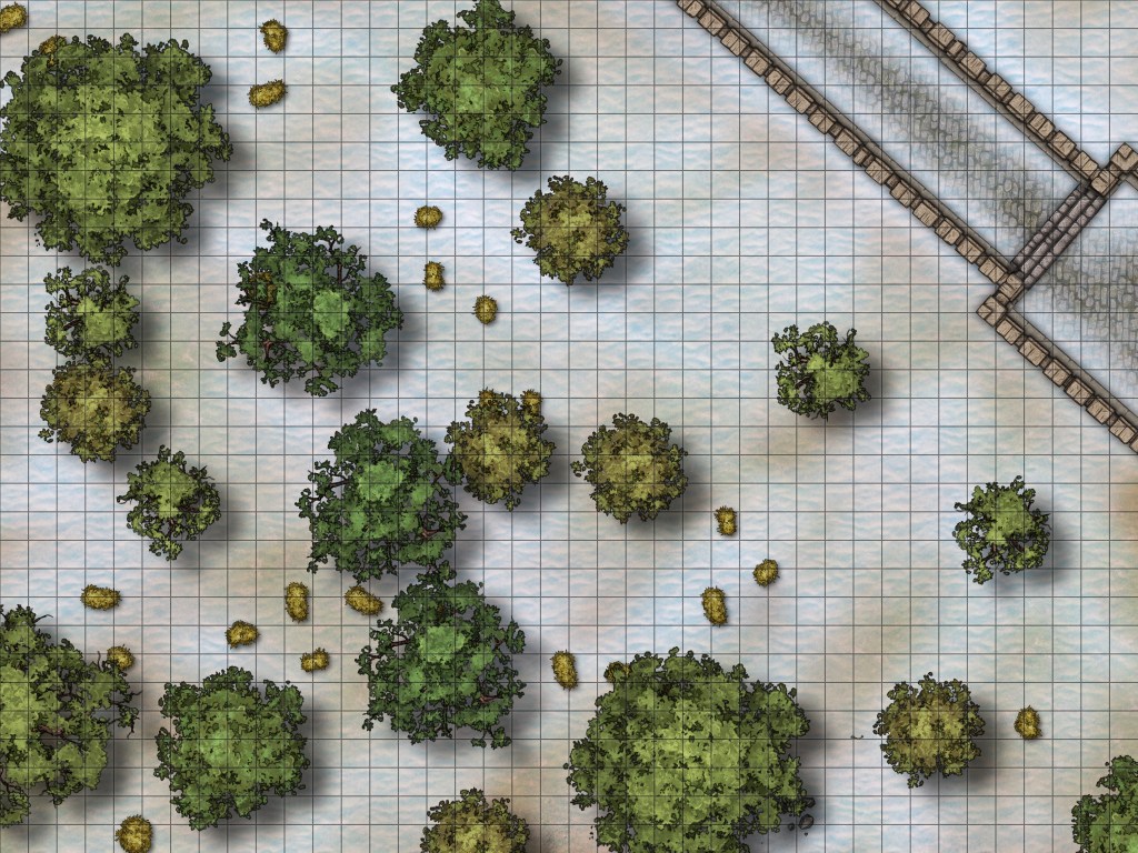 More forest-y than the other maps this one would be a good candidate for a “breached wall” part of the battle. Where the wall crumbles and Oni, undead and other creatures who are fighting spill into the woods past the wall. This map links in immediately left of the main map and south (under) west 2 where the walls should just line up nicely.