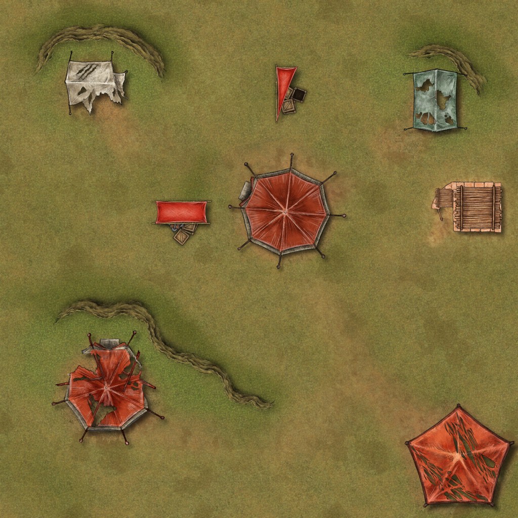 The immediate area around the central tent is the primary zone, zone one. The distance between the central tent and the cliffy-hills in any direction is the second, third and fourth zone (in any order and then the bottom, top left and top right parts of the map and beyond can have a line drawn from the hill to the to either the tent of cloth covered boxes is an additional zone each. This gives range, requirements for movement and versatility in how we run our encounters.