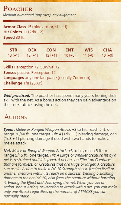 The poacher is a blight on society, where there are laws that govern how creatures can be treated. In reality they are men and women who have trained in the tracking and capturing of creatures using the tools that they have available to them. These men and women prowl the woods, plains and other wild places looking for their targets. Then, acting as a cohesive pack they strike and capture their prey, nearly without fail.