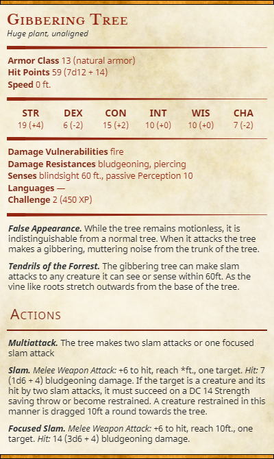 As the woods are deep and wide so are the types of flora and fauna. The sound of something moving through the air is the first sense of danger that the party encounter before the muttering begins. A manic, confused gibbering that seems to come from all around them as these large vine like whips strike at them. The gibbering grows in intensity the more the striking vines connect with the party, and a large tree can be seen near by if the vines are followed.