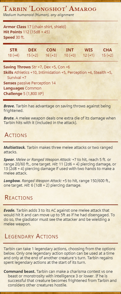 The leader of the poachers, Tarbin, is as experienced in hunting and capturing beasts and monstrosities as a gladiator is at fighting. As he steps in front of the party his confidence and command exude from him. It’s not hard to see how even the beasts cower before such a man as he is the pack alpha out here.