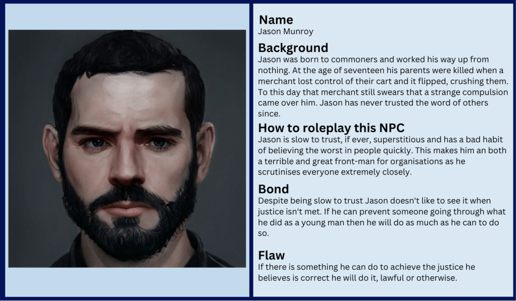 Pending if this would be seen as useful this can be expanded to have additional information on the card itself. Accents (if people want to have a go at that), nervous ticks, trinkets they have, notable characteristics or mannerisms and so on.