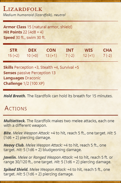 The lizardfolk are fearsome warriors. Attacking from a range with Javelins before engaging in melee these creatures fight for both survival and food. The Brute will wade into the front lines and use its bulk and strength to try and break the defences of the party. While the other Lizardfolk would harass and act like flankers for their larger cousin.