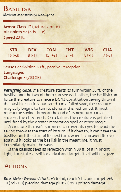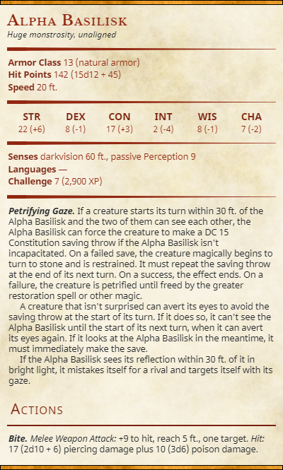 Attacking quicker the smaller basilisk maybe will be over zealous, or as the lore of the basilisk goes the older they get the more sluggish they become. Relying on ambushing their prey rather than running them down. However there is a very real risk of death with this encounter so the party best beware.