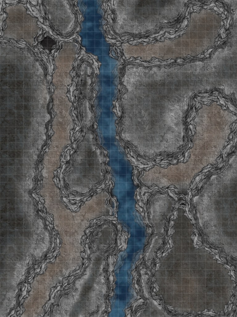 A Long rocky path and cave that has a few chambers off it. The first path to the right has a ‘secret’ path up to another little area where you may choose to hide something. Perhaps a surviving miner or two who could have some wisdom for the party.