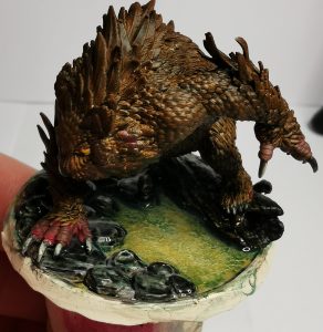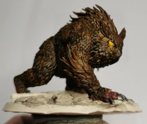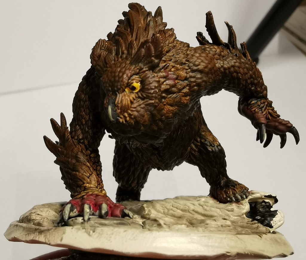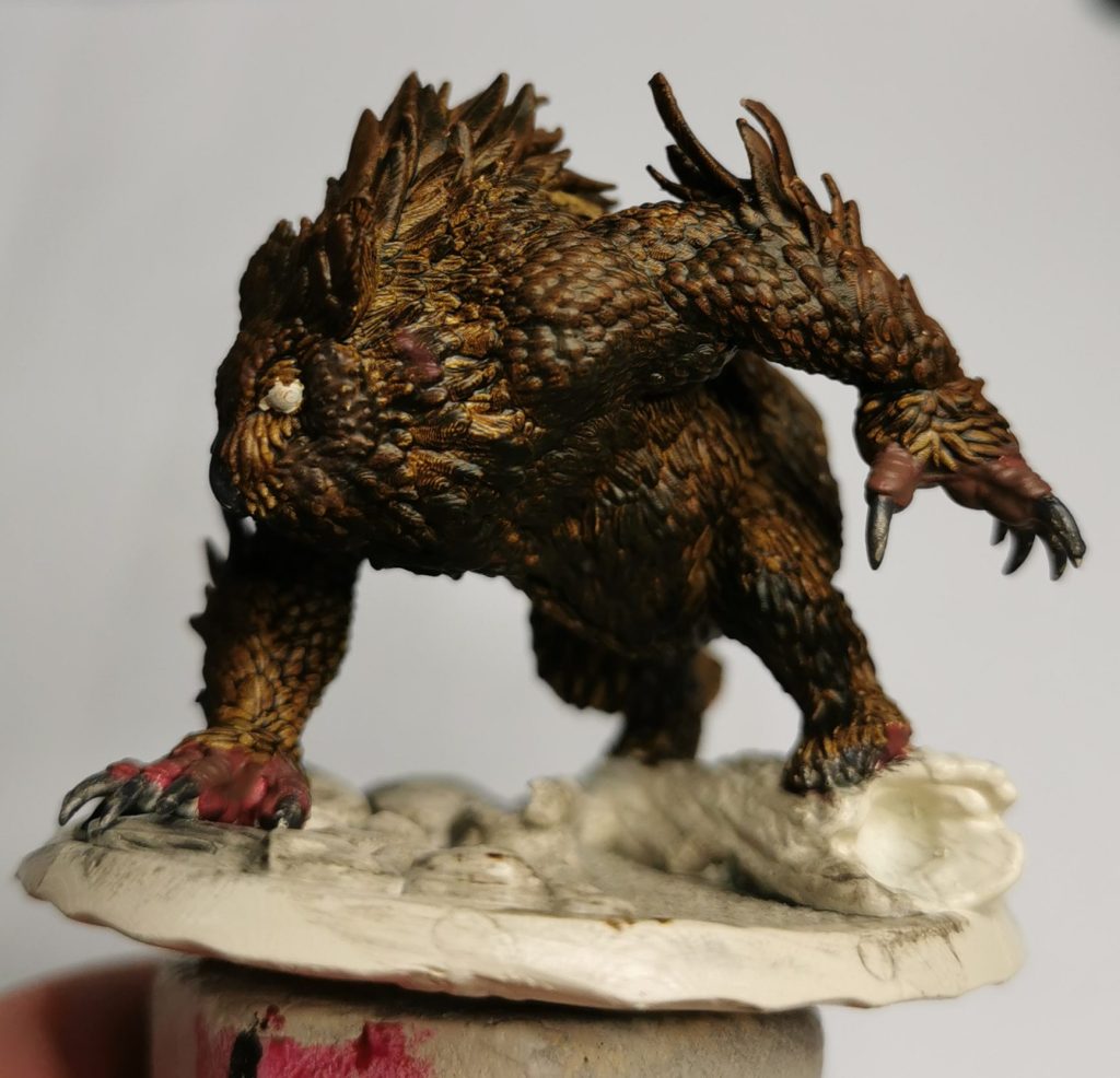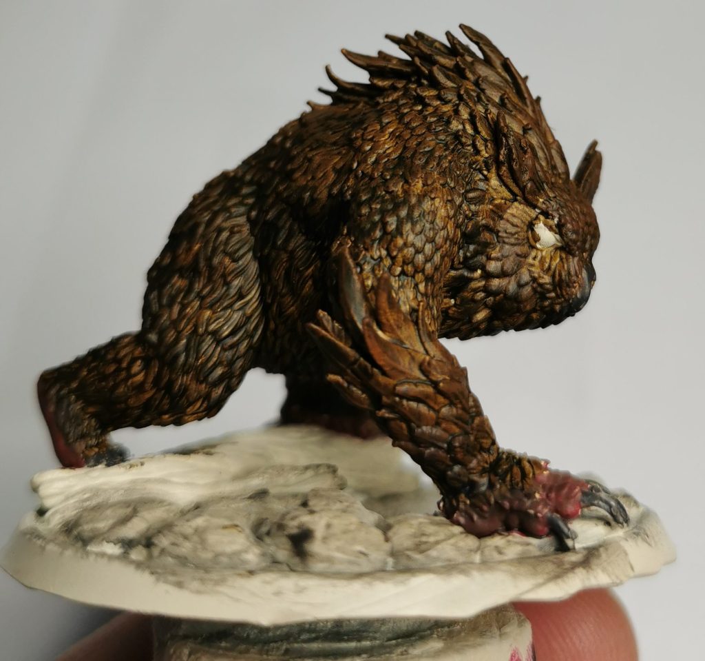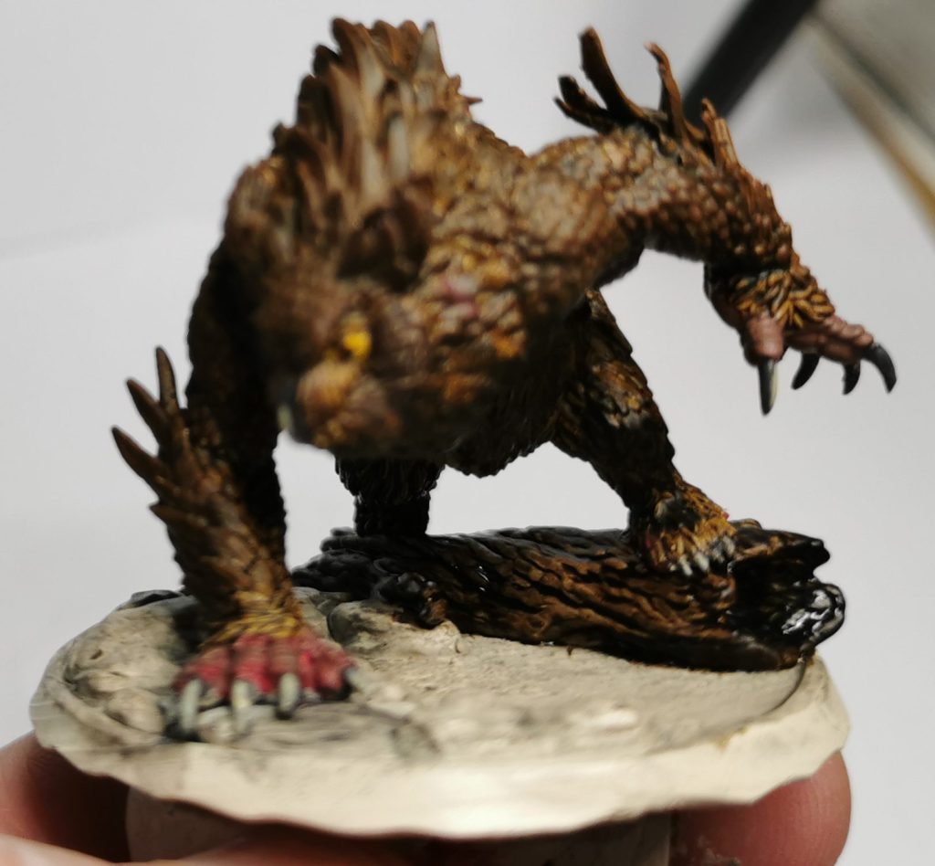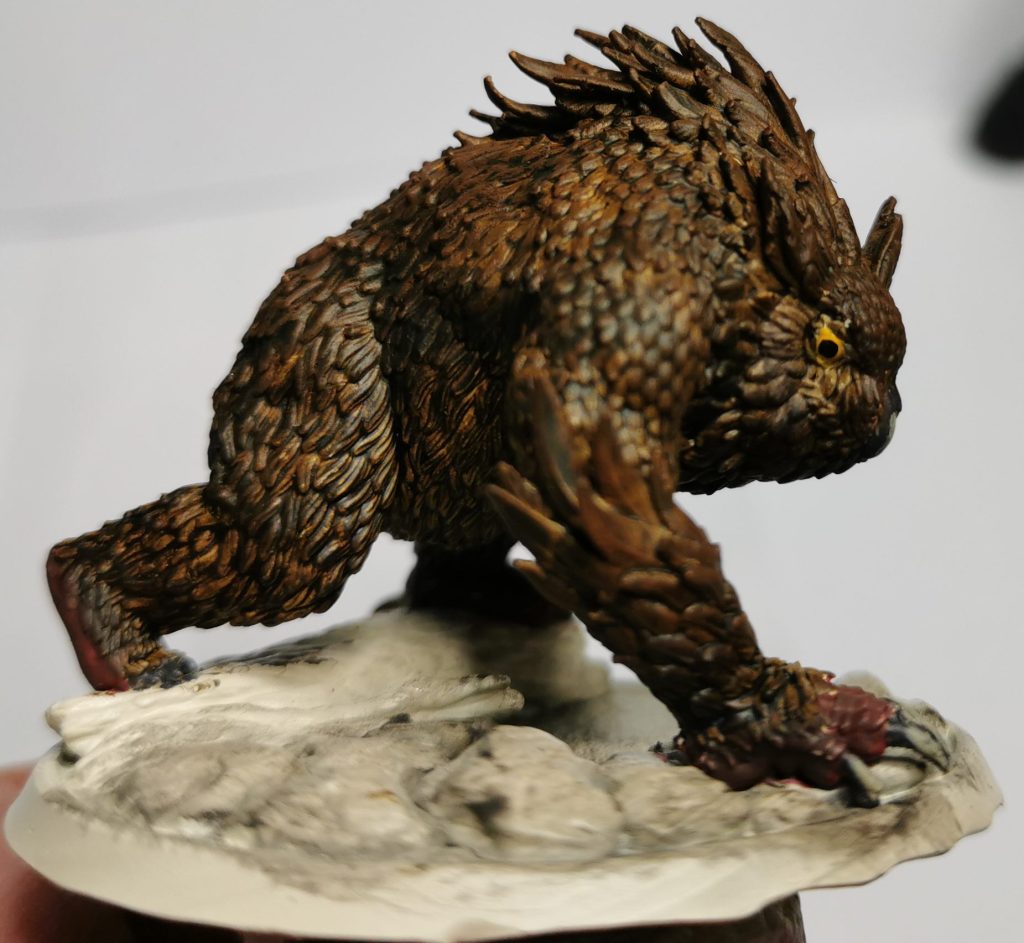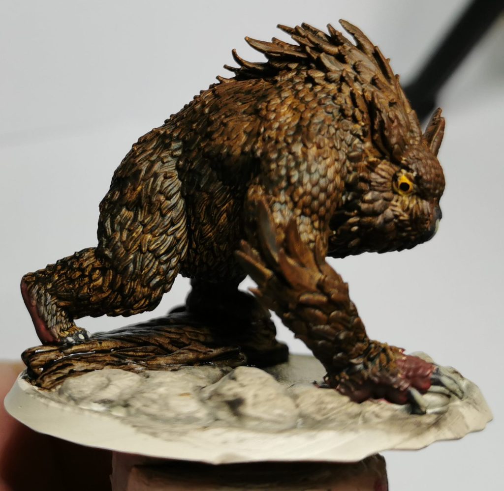 Now just like Cats owlbears have little toe-beans… Ok maybe not but for this I did a two step approach to get a different skin tone for them. Starting off with a thinned layer of Citadels Khorne red I then hit it with Citadels Gorthor Brown. this gave it a more fleshy colouration than the brown itself and broke it up from the brown of the feathers.
