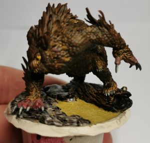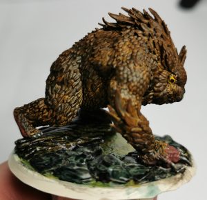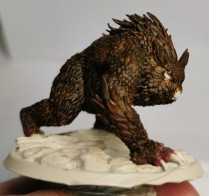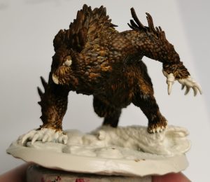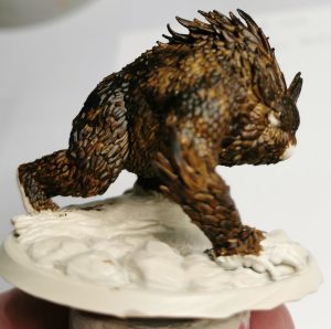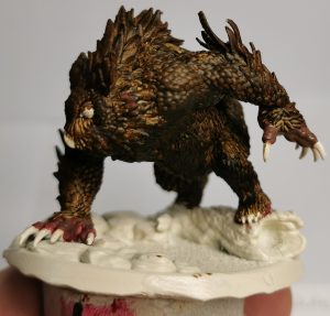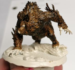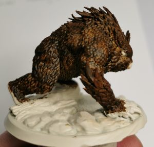 The next part for me was deciding if I wanted to go a dark grey owlbear or a brown on. White is a bit of a harder one to do and coming from a cream base brown or grey would show up well. Opting for Brown I selected Citadels Garaghak’s Sewer paint and applied it as evenly as I could for the first part.