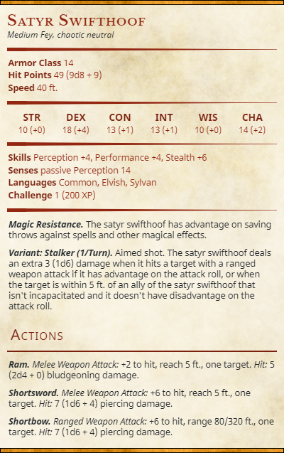 Unlike the Satyr Warhorn the Satyr Swifthoof are thinner, lither and pride themselves in sudden volleys of targeted arrows that bring down their target. Preferring to be stealthy they typically hide to the edges of combat and launch volleys of arrows. Rarely do they willingly go into combat but if they need to they will.