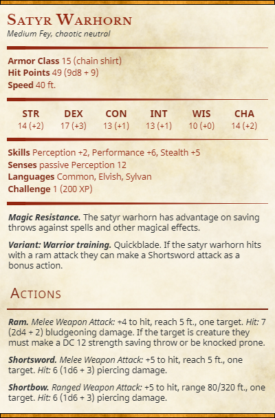Preferring melee to ranged combat these warriors are more heavily armoured than their lesser kin. They are also stronger and slightly bigger than their other Satyr kin. Driven to attack in frenzied bouts they charge into combat, ramming their targets before slashing at them with their short blade.