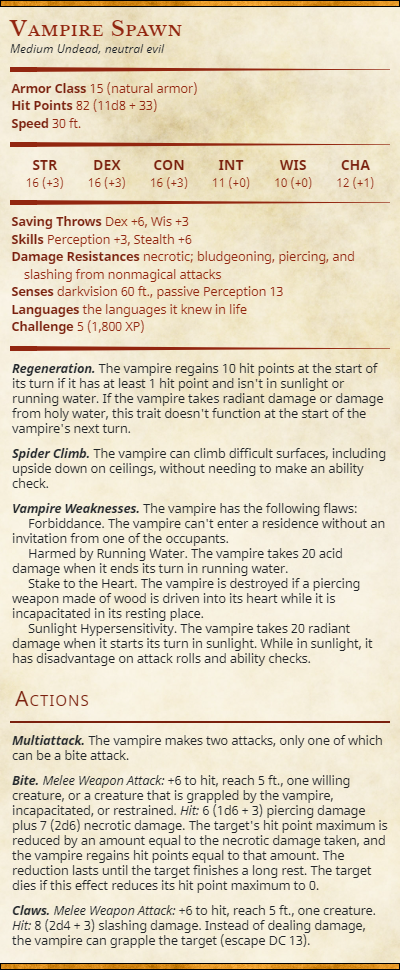 But these hunts need to have a leader. Enter the Vampire Spawn. Now I know what you’re thinking. Vampires are no joke, their spawn are pretty lethal so will the sheer volume of bodies be too much? Probably not, but perhaps. So monitoring the flow of the combat and having the spawn enter when required to step up the pace would be ideal.