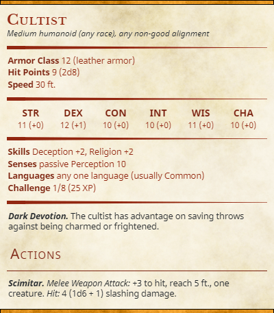 Thanks for visiting tonight more low level stat blocks for the adventure. Come back tomorrow to get a look at the tournament progress, day 1 results and hopefully a picture of the army that I mentioned last week. Don’t forget to come back this weekend as we produce the end of the weeks writeup. And lastly, as always, don’t forget to roll with advantage