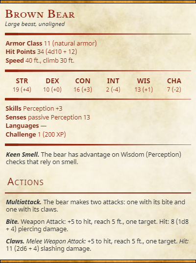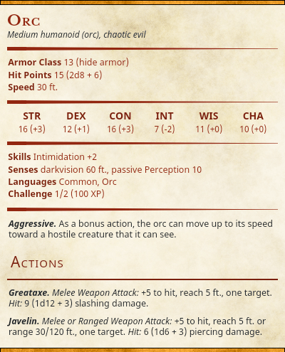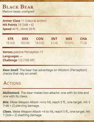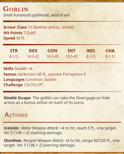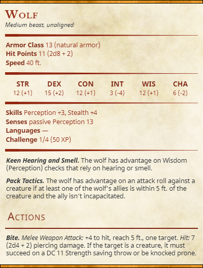 Welcome to another Friday night where tonight we are looking at the Denizens of Trenchold Woods. These are good creatures for level 1 or level 2 parties to encounter and can make for a fun and enriching adventure despite being cliche. But you can scale this to a larger encounter by adding more creatures or looking at higher CR creatures (such as trolls or hobgoblins) to be the aggressor in this weeks adventure. So sit back as tonight we investigate stat-blocks!