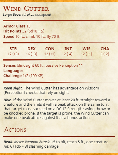 The Wind cutter goes by a few names but it is a much smaller cousin of the wyvern and winged drakes that people may be familiar with. With a wingspan of twelve feet and large muscles that power these massive sails they are quick and strong.