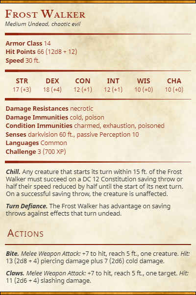 The Platara Glacier is home to some hardy fauna, and flora for that matter but a recent incursion of creatures, the Frost Walker, poses a new threat. This week the Party meet the Frost Walker as it prepares to feast on the stolen tribespeople. So let’s sit back and meet this undead menace!