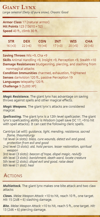 Revered amongst the Platara people the Giant Lynx is the rarest of the ice fields deities. These majestic celestials only take an interest in the events that happen on the material plane when something of great significance is occurring. These creatures however are as playful and fickle as magic itself and are often through to be the manifestation of a whim from gods of magic.