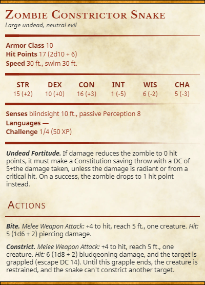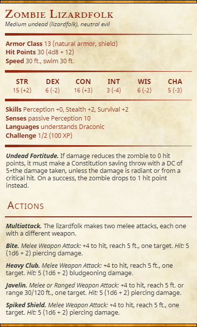 Reanimated snakes as well as the true denizens of the Carrion swamps, the lizardfolk are also a pest that the party will have to deal with. While not tough they can provide a threat to the party if they are not prepared to deal with these large snakes and even more ferocious humanoids.