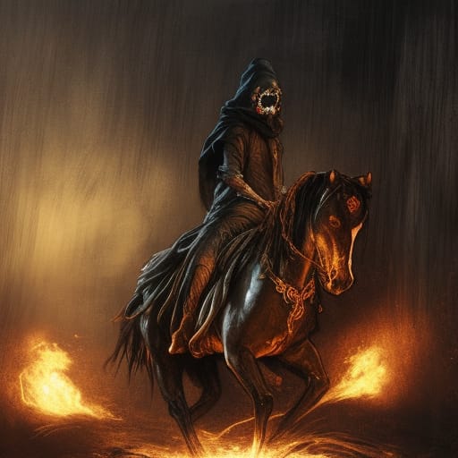 The creature’s raised axe hesitated, a look of hatred flashed across the burnt, cracked flesh from under the hood, and in the beat of a heart the creature hurled itself on the back of the mare. Up close and clear to see in the dying light the mare’s body was sunken and its mane and tail were made from cinder ridden smoke. With a fearsome whinny the creature turned the mare around and kicked out with ember-red hooves into the centre of Arlorns chest pushing the arrows in further and sending the man crashing into the party.