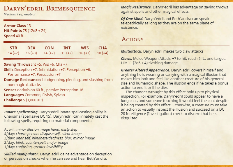 While their stat blocks are geared towards a CR5 encounter they don’t like taking life as that would put a quick stop to their fun. They will try and prevent the loss of life so they can continue their mischief and gain more amusement and joy from the people of Rimeglenn becoming increasingly confused as chaos grows in the city.