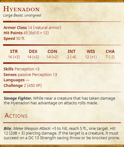 Then it was joined by a second who in its bloodlust narrowly missed Barry. Soon the party engaged attempting to keep the creatures at bay while not fully committing to the fight. That was until the giant creature, a Large Hyenadon, attacked Henrey who was left stranded alone. Soon the Henrey was fleeing to the safety of the party only to be chased down and bitten clean in half by the jaws of the massive beast.