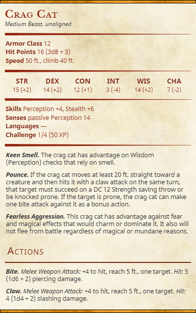 As the final stout crag cat lay breathing its last breaths on the ground before them the party could not help but wonder what had driven these creatures to madness. They looked over the creatures for any sign of infection or disease but there was no sign of them. No bite marks, no bruising, no sign of worms or parasites and nothing that would indicate what drove them to attack beyond the point of reason.