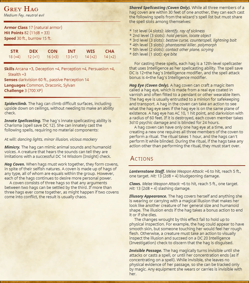 Tonight we look at the source of the problem in Morrowdeep with the revelation of the creature causing the problems. This particular statblock, much like the common one we see for this (the green hag) gives us an option for higher level combat as well. A single hag isn’t too threatening but a coven could be a real challenge for a level 4 or 5 party.
