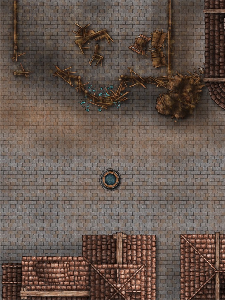 The map is, like all of mine, made from different texture brushes overlapping to create the feel that I am going with. Being a well established town having stone roads makes sense and with the heat of the blaze, the foot traffic and clean up crews have moved most of the debris out. This causes dirt and soot to be moved, most of the burnt tables, chairs and such are piled up out the front between it and another building.