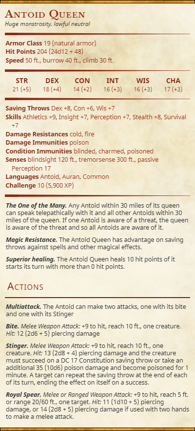 And there we have it for tonight. The Antoid race and even the queen itself! Don’t forget to come back this weekend as we plan to get some Zines out and, as always, don’t forget to roll with advantage,