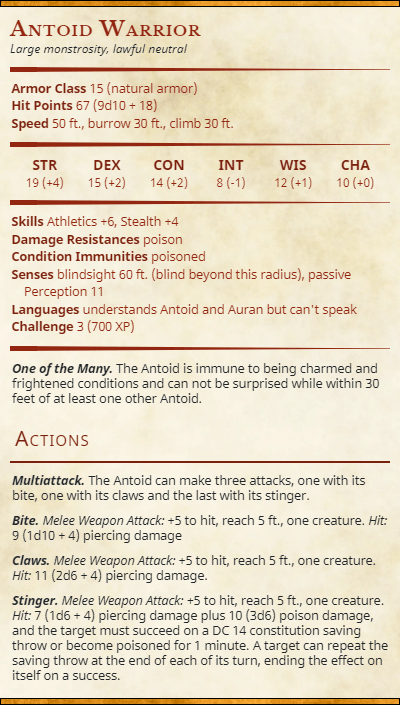 Now extremely dangerous in swarms, and nearly no less deadly by themselves these creatures are a menace to all desert dwellers. Smarter and stronger the warrior caste of the Antoids are vicious and unrelenting when defending their nest or acting out their orders. Thicker armour, a stronger bite, sharpened claws and a deadly stinger these creatures are a threat for all parties.