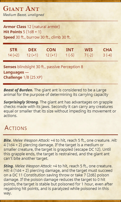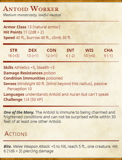 The lowest form of the Antoid caste the Antoid Worker is a humble creature. Strong yet not overly smart they rely on being told what to do and how to do it. Natural thick hide acts like armour for these creatures but they don’t really have any real weapons other than the jaws that they were born with.