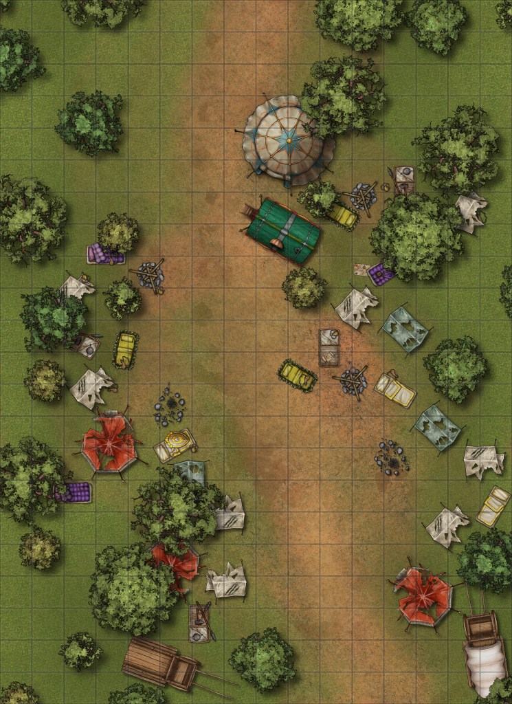 Trees, tents, camp fires and a wagon or two line up tonight’s map. This provides ample room to hide, sneak and get cover from the flurries of arrows that fly onto the battlefield and into the party’s ranks.