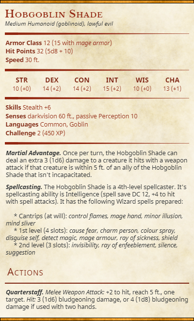 These elite agents are not the strongest of fighters but they are lethal nevertheless and parties should, and do, fear the Hobgoblin Shade when they are rumoured to be embedded in a warlords army.