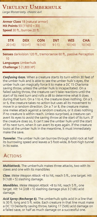 The Virulent Umberhulk uses acid to burrow through stone quicker but weakening it before attacking with its claws. These heavily armoured creatures strike fear into all that encounter them. These are stronger, deadlier denizens of the stone tunnels and could be used as the finisher of an larger encounter.