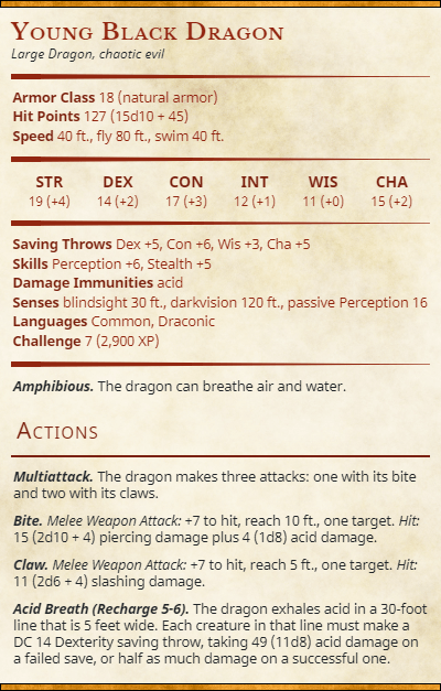 So before we look at some notes on last weeks update – A different Initiative I want to add another contender to the adventure. It’s not a strange occurrence of even for adventurers to have knowledge that black dragons spit acid and have a thick scaly hide. These adversaries are tough, smart and deadly let alone being trapped in an arena with one.