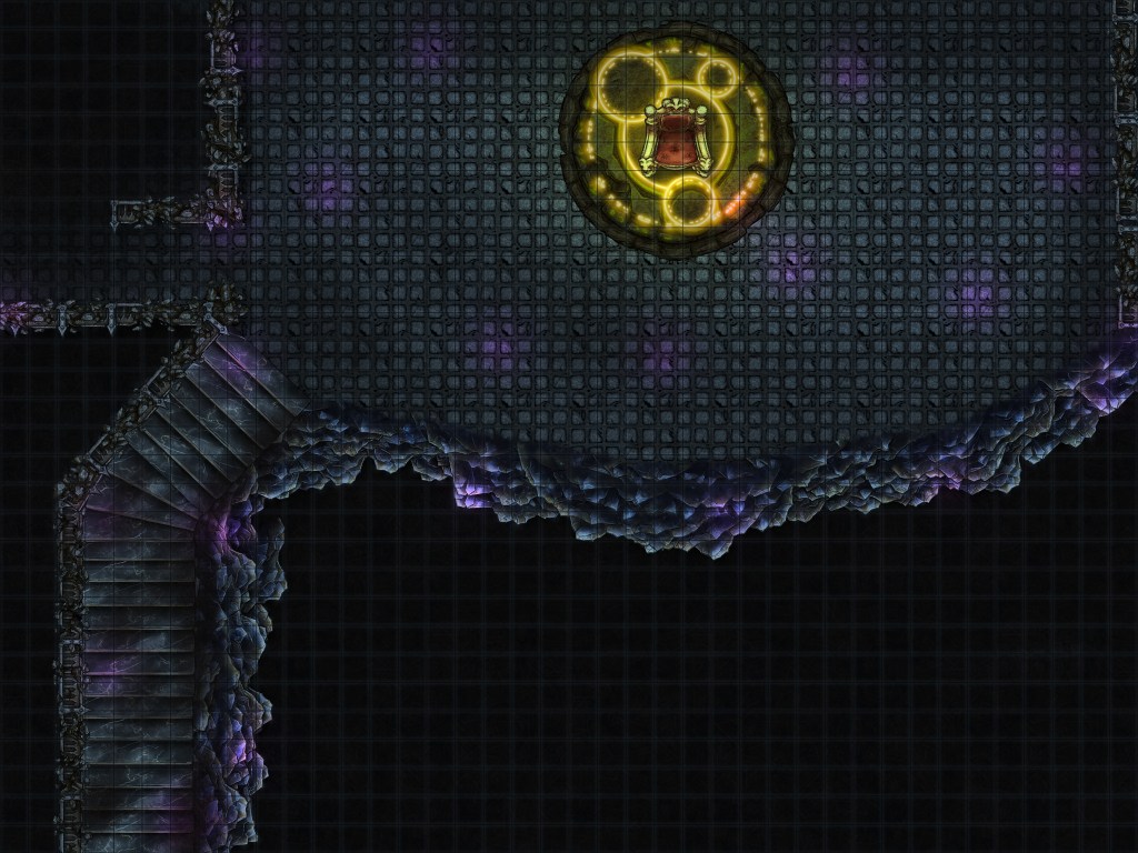 A few overlapping textures here, dark stone, stone tiles and a shadow make up the majority of the background art assets where overlapping and layered stone makes up for the edge of the void. Pockets of light, a throne, two magical seals and then walls makes up the rest which, I think, gives the rest of the room a forbidden and foreboding vibe.