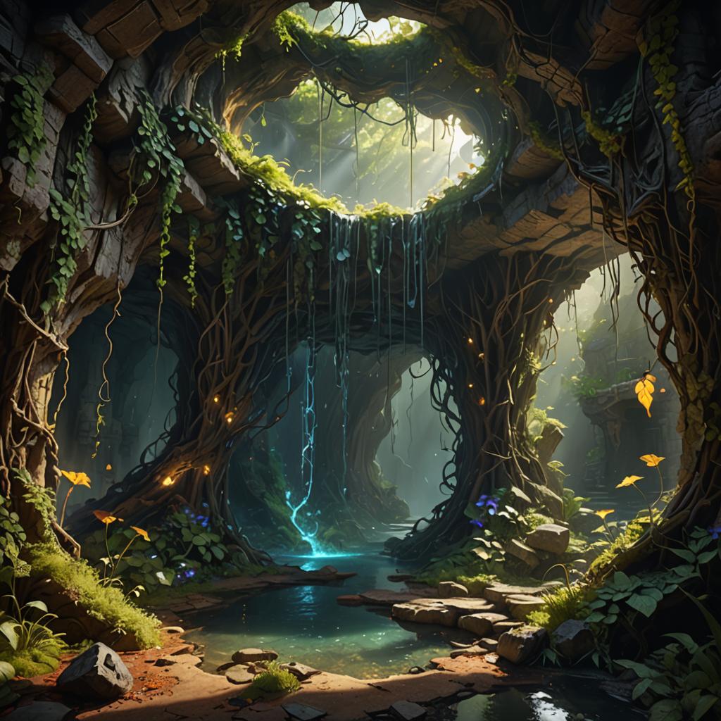 Moving towards the hilt the vegetation underfoot became thicker with more roots and vines covering the ground underneath making each step more precarious than it needed to be. As they neared the hilt the vegetation shifted underfoot for a moment before, with the sound of cracking and snapping the ground gave way and the adventurers scrambled to stop themselves from falling. Those that were too slow found themselves suspended in a strangely light drenched sinkhole where a branch of the river trickled slower deeper into what appeared to be caverns that had been eroded by the water.