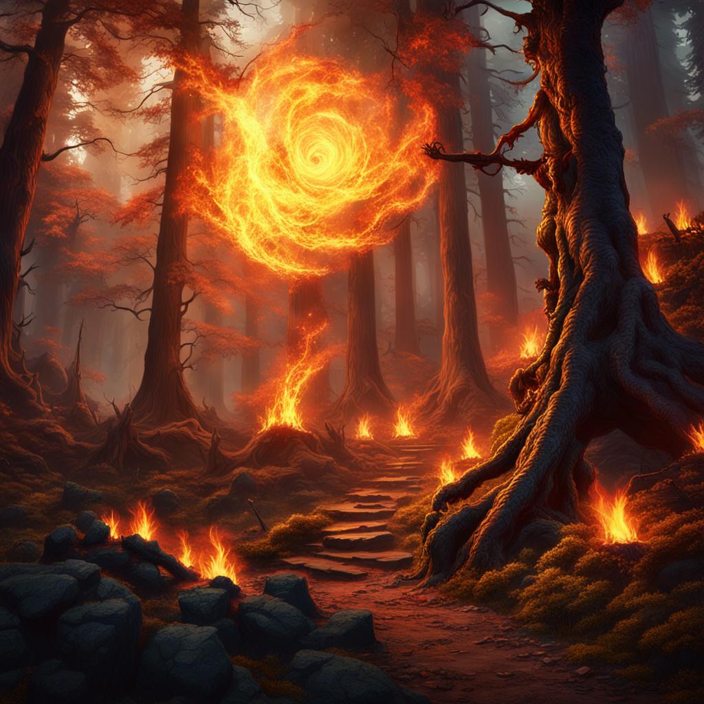 As the party raced across the wooded path fires roared through the trees around them. As the fire chewed through the wood the sound of burning leaves, sizzling bark and the fire as it created a wind current for itself sounded like the chittering laughter of foul creatures. The embers raced through the trees carried upon these winds as if alive and where ever they landed new fires were born. The fire was born from dark magic and it acted as voracious as was the nature of such things.