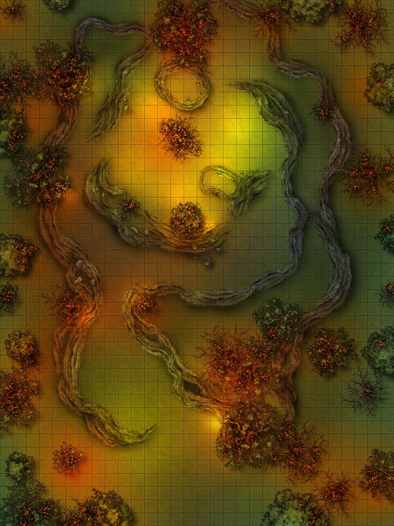 Trying to highlight the intense heat of this encounter has made the forest come alive with reds and yellows. The contrast with the green grass makes the peak of the mountain feel more like a psychedelic episode rather than an intense battle with a powerful mage and elemental. Rocks and steep paths lead up to the peak and embers litter the trees creating hazards that the adventurers must watch out for.