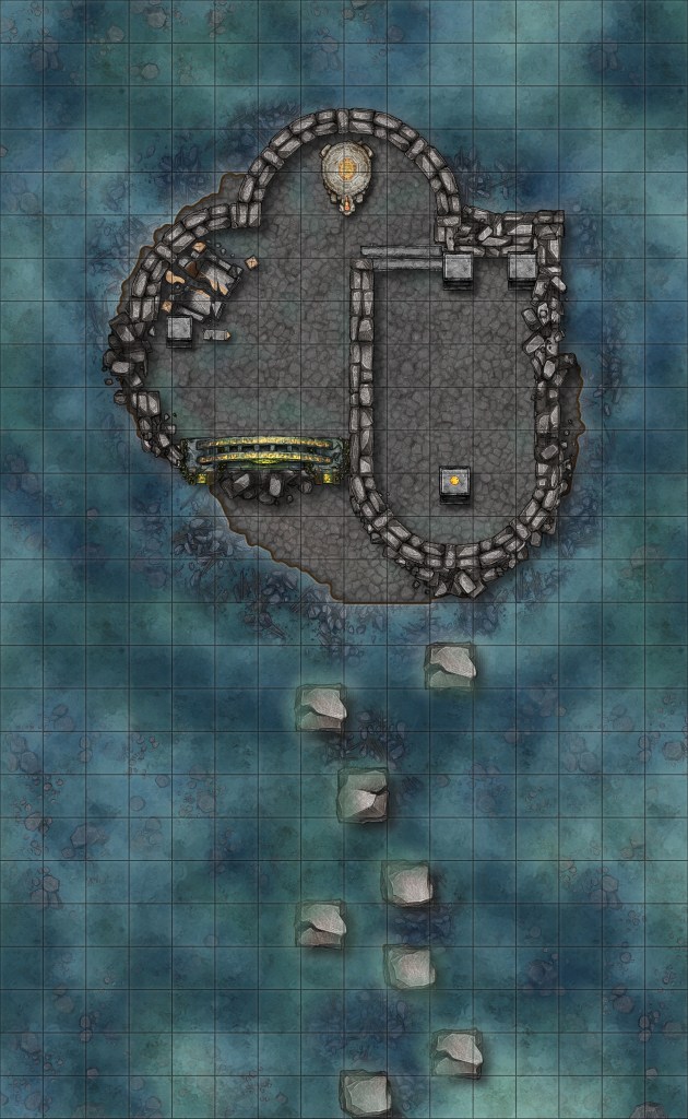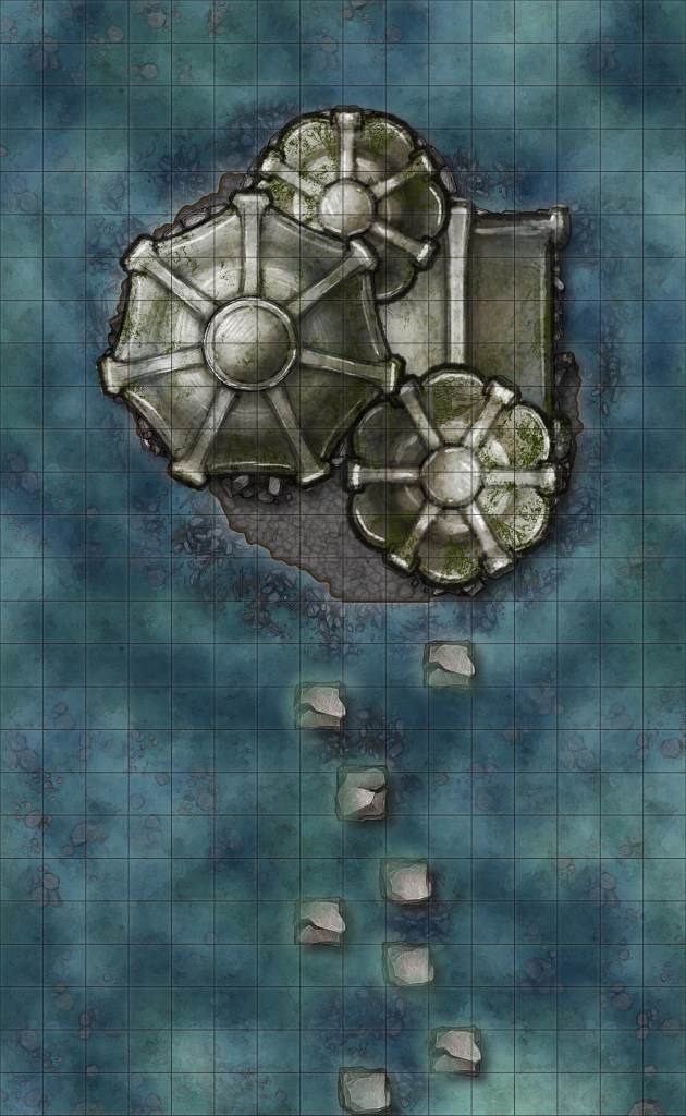 While the vault rising from the lake bed we have a lot of debris under water. However slippery stones have formed a bit of a path leading to the vault where the party are greeted by a great door.